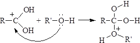 Стадия 2. Нуклеофильная атака молекулой спирта карбонильного атома углерода