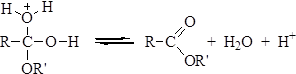 В результате реакции образуется равновесная смесь. Чтобы сместить равновесие в сторону образования продукта, используют большой избыток спирта или удаляют воду по мере ее образования. Механизм этерификации представляет собой реакцию присоединения -отщепления (нуклеофильное ацильное замещение), его можно представить в виде следующих стадий: Стадия 1. Атака молекулы карбоновой кислоты протоном