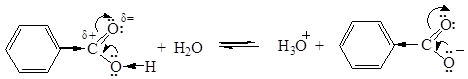 Монокарбоновые кислоты ароматического ряда – бесцветные кристаллические вещества с температурой плавления выше 100°С. Кислоты с заместителями в п- положении плавятся при гораздо более высоких температурах, чем их изомеры. Температуры кипения и плавления ароматических кислот выше, чем у кислот жирного ряда с тем же числом углеродных атомов. Монокарбоновые кислоты плохо растворяются в холодной воде и значительно лучше в горячей. Низшие ароматические кислоты летучи с парами воды. Химические свойства В водных растворах ароматические монокарбоновые кислоты обнаруживают большую степень диссоциации, чем алифатические кислоты (Ка бензойной кислоты 6, 3∙ 10-5, Ка уксусной кислоты 1, 8∙ 10-5). Большая степень диссоциации бензойной кислоты обусловлена отрицательным индуктивным эффектом бензольного кольца, приводящим к некоторой стабилизации карбоксилат – аниона: