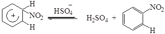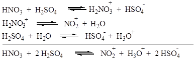Нитрующим агентом является нитроний-катион (NO2)+, образование которого в смеси азотной и серной кислот описывается следующими уравнениями: