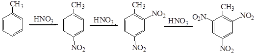 Третья нитрогруппа вводится в молекулу 1, 3-динитробензола с еще большим трудом с образованием 1, 3, 5-тринитробензола. В то же время толуол нитруется до тринитротолуола в более мягких условиях, чем бензол. При нитровании толуола образуются три изомера о-, м - и п- нитротолуолы: