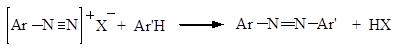 Реакция азосочетания протекает по механизму реакций электрофильного замещения, атакующим агентом является катион диазония. Поскольку диазоний-катион слабый электрофил, то он атакует лишь реакционноспособные кольца, содержащие электронодонорные группы (ОН, NH2, NHR, NR2). Замещение обычно происходит в п -положение к активирующей группе, а если оно занято, то в о -положение: