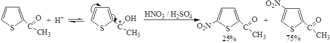 Использование различных условий позволяет изменить соотношение изомеров. Если реакцию проводить в сильнокислой среде, то будет образовываться 25% 5-нитро-2-ацетилтиофена и 75% 4-нитро-2-ацетилтиофена.