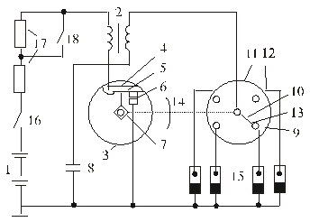 Классическая система батарейного зажигания с одной катушкой и многоискровым механическим распределителем до сих пор широко распространена на находящихся в эксплуатации автомобилях. Главным достоинством этой системы является ее простота, обеспечиваемая двойной функцией механизма распределителя: прерывание цепи постоянного тока для генерирования высокого напряжения и синхронное распределение высокого напряжения по цилиндрам двигателя. На рис. 3 представлена принципиальная схема классической (батарейной) системы зажигания. Схема состоит из следующих элементов: - источника тока - аккумуляторной батареи 1; - катушки зажигания (индукционной катушки) 2, которая преобразует токи низкого напряжения в токи высокого напряжения. Между первичной и вторичной обмотками катушки зажигания имеет место автотрансформаторная связь;