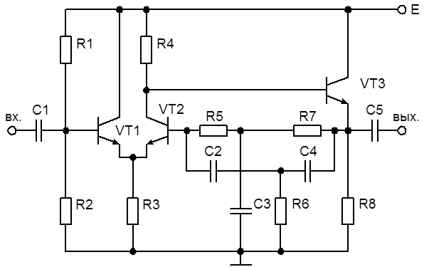 Для электронной схемы избирательного RC-усилителя на основе двойного Т-образного моста в цепи обратной связи (рис. 6.1) сформировать матричную математическую модель по переменному току для полного диапазона частот методом эквивалентных схем. Биполярные транзисторы VT1 и VT3 представить низкочастотной эквивалентной схемой для системы h-параметров транзистора, включенного с общим коллектором (рис. 6.2, а), а транзистор VT2 – низкочастотной Т-образной физической эквивалентной схемой (рис. 6.2, б). Определить передаточную, входную и выходную схемные функции; построить амплитудно-частотные и фазо-частотные характеристики. Определить передаточную, входную и выходную схемные функции обобщенным матричным методом; построить амплитудно-частотные и фазо-частотные характеристики.