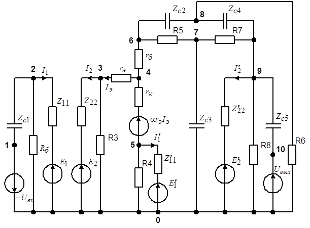 Используя эквивалентные схемы биполярных транзисторов, представленные на рис. 6.24, 6.25, получим схему замещения избирательного усилителя по переменному току для полного диапазона частот, приведенную на рис. 6.26.