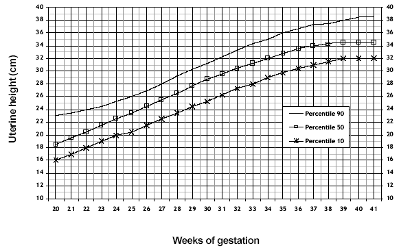 1) Ведение гравидограммы Прогностическая ценность ВДМ увеличивается при использовании серии исследований и при графическом изображении показателей в виде гравидограммы. Данный график должен быть приложением к каждой обменной карты. Гравидограмма является скрининговым методом для выявления низкой массы плода для данного срока беременности.