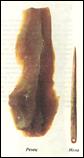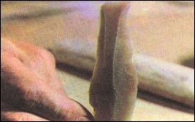 Тиксье держит пластину, которую ему предстоит обработать в резец, затупив один из острых краев. Но прежде ему нужно подготовить верхний конец пластины, по которому он будет бить ретушером