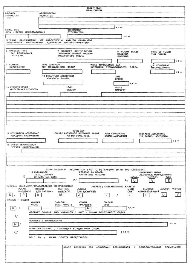 1. В том случае, когда термин " аэродром" используется в плане полета, он кроме аэродромов охватывает также места, которые могут использоваться воздушными судами определенных видов, например вертолетами или аэростатами. 2. Номера пунктов на данном бланке не приводятся в последовательном порядке, поскольку они соответствуют номерам полей в сообщениях ОВД, касающихся FPL. Бланк FPL состоит из 3-х частей (рис. 4): - часть 1. Адресная часть. - часть 2. План полета. - часть 3. Дополнительная информация.