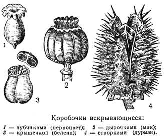 Сухие вскрывающиеся плоды содержат несколько, у некоторых много семян. В зависимости от способов вскрывания и отчасти количества гнезд они делятся на ряд более мелких типов: листовка, боб, стручок, стручочек, коробочка.