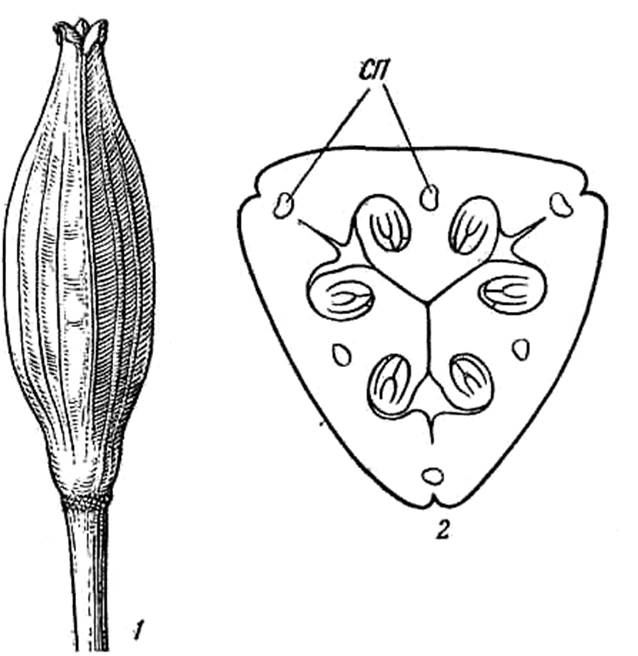 Синкарпная коробочка тюльпана (Tulipa gesneriana): / — общий вид незадолго до вскрывания; 2 — поперечный разрез через завязь: СП — сосудистые пучки.