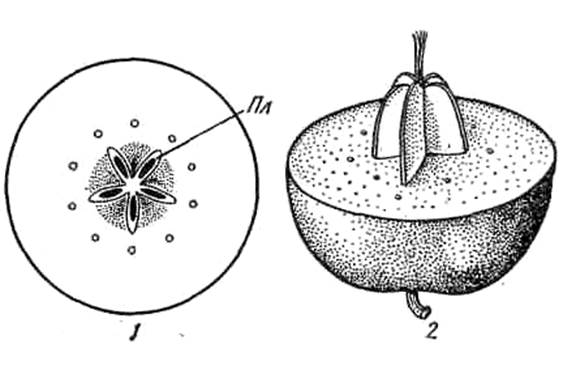 Яблоко яблони (Malus domestica): 1— поперечный разрез 2 — яблоко с отпрепарированные ми плодолистиками; Пл — граница плодолистиков.