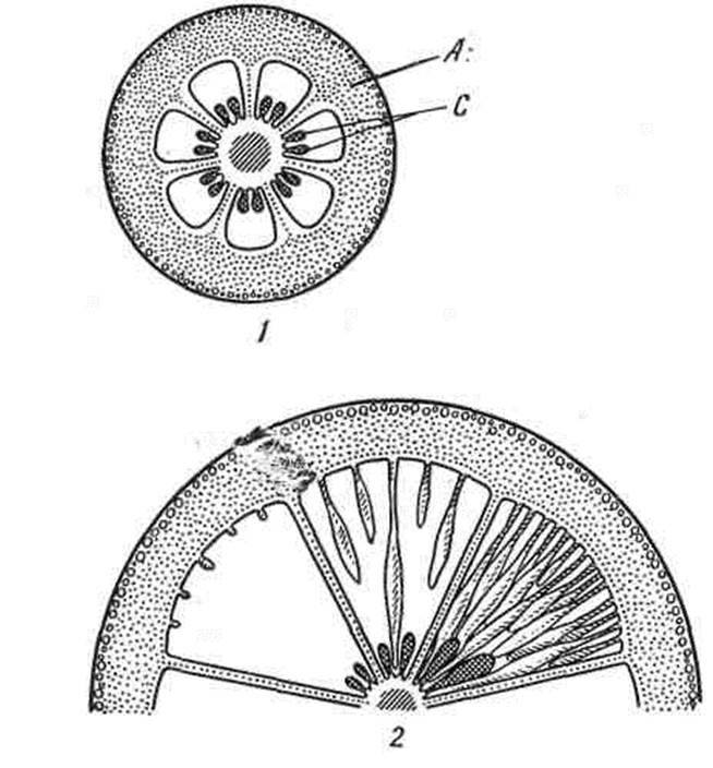 Плод апельсина: 1 — схема поперечного разреза через завязь; 2 — сек» гор плода в поперечном разрезе; А — альбедо; С — семена.