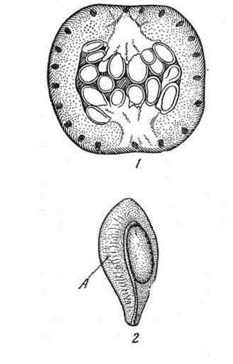 1 — поперечный разрез через незрелый плод; 2 — семя со слизистым ариллусом (А). СПОСОБЫ РАСПРОСТРОНИНЕЯ ПЛОДОВ