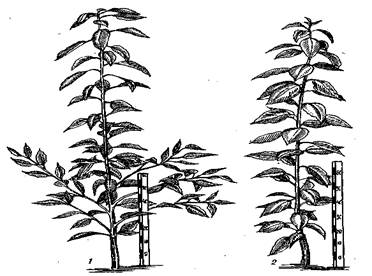 Рис. 13. Влияние скороспелости почек на ветвление однолетних саженцев в питомнике (по А.С. Девятому): 1- сорт со скороспелыми почками образовал кронистую однолетку; 2 – неразветвленная однолетка сорта с нескороспелыми почками. Первое представляет собой суммарное количество любых разветвлений к общему количеству боковых почек. Ростовое ветвление предполагает способность почек образовывать длинные побеги. При обрастающем ветвлении образуются листовые розетки и короткие разветвления (кольчатки, букетные веточки, шпорцы). Если имеет место массовое образование кольчаток, то в этом случае говорят о кольчаточном типе плодоношения. Преобладание скелетного ветвления обусловливает образование густой кроны с большим количеством удлиненных ветвей, плодовых прутиков. Важно учитывать и такие свойства боковых почек побегов, как их скороспелость, возбудимость.