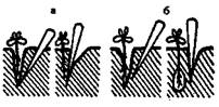 Существует способ пикировки, который называется пикировкой ключками. Ключки – это проросшие семена, образовавшие корешок длиной 2-3 см. Перед посадкой у них прищипывают верхушки корешков. При пикировке ключки заделывают в почву на 0, 7-1 см ниже ее поверхности. Пересаженные растения мульчируют, часто поливают. Уход за сеянцами предусматривает систематическое рыхление почвы, борьбу с сорняками, 1-2 подкормки минеральными удобрениями или разбавленной навозной жижей, птичьим пометом. При выращивании сеянцев без пикировки обычно применяют двухрядный способ посева с шириной междурядий 60-70 см и расстоянием между рядками 20 см; глубина заделки в почву семян яблони, груши 3-4 см, вишни, черешни – 4-5 см, алычи, сливы – 5-6 см. Для усиления разветвленности корневой системы яблони, груши, алычи и дикой черешни подрезают стержневые корни на глубине 10-15 см при высоте сеянцев 10-12 см. После подрезки растения обязательно поливают, а после восстановления их роста прореживают, оставляя между растениями в рядке 8 см. Дальнейший уход аналогичен уходу в случае с пикированными сеянцами. В начале октября подвои выкапывают, удаляют листья, сортируют. К первому сорту относят подвои с разветвленной и мочковатой корневой системой, имеющей не менее трех основных разветвлений и толщиной корневой шейки не менее 6-7 мм. Тонкие подвои с корневой шейкой менее 3-5 мм и хорошими корнями могут доращиваться на протяжении года в нулевом поле питомника. При сортировке стволик сеянца укорачивается до 30-40 см, а корни – до 15-20 см. На зиму подвои прикапывают на глубину 25-30 см на участке не затапливаемом водой. Вегетативное размножение подвоев используют при выращивании слаборослых подвоев яблони низкой (дусен, парадизка) и айвы. Для этого используют специально заложенные маточно-отводковые плантации. На них маточные растения высаживают на расстоянии 1, 5х 0, 5 м и формируют в виде кустов. Обычно слаборослые подвои размножают вертикальными и горизонтальными отводками. Для получения вертикальных отводков маточные кусты ранней весной обрезают до 2-3 см. По мере отрастания побегов их окучивают влажной почвой. Для укоренения горизонтальных отводков побеги пригибают к земле и прикапывают. Осенью укорененные побеги отделяют от маточного растения и используют потом в школе саженцев.
