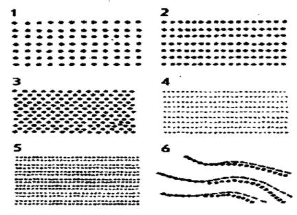Рис. 25. Схема размещения деревьев в саду: 1 – квадратная; 2 – прямоугольная; 3 – шахматная; 4 – ленточная; 5 – контурная; 6 - свободная.