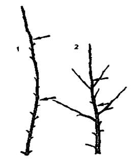 1 – трехлетняя ветвь без укорачивания; 2 – трехлетняя ветвь, у которой укорачивали годовой прирост.