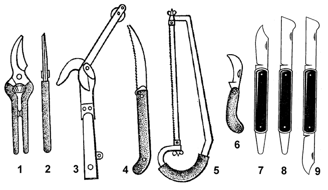 Рис. 35. Садовые инструменты: 1, 2 - секатор; 3 – сучкорез; 4 – складная ножовка; 5 – лучковая пила; 6 – садовый нож; 7 – окулировочный нож; 8 – прививочный (копулировочный) нож; 9 - комбинированный нож.