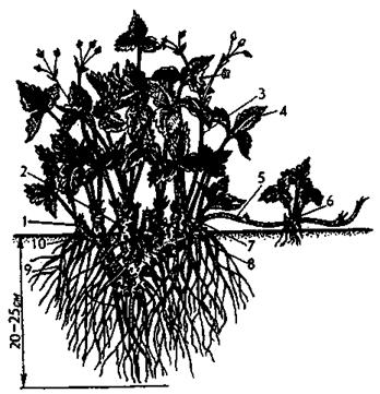 Рис. 36. Строение куста земляники садовой: 1 – однолетний рожок; 2 – многолетнее корневище; 3 – цветонос; 4 – лист; 5 – ус; 6 – розетка; 7 – верхушечная почка; 8 – пазушная почка; 9 - боковые корни; 10 – придаточные корни рожка. Отличительной особенностью земляники является отсутствие верхушечного роста стебля. Из верхушечной почки весной образуется цветонос с соцветием, отмирающее после плодоношения. Новые стебли образуются как разветвления из боковых почек. Корневая система земляники садовой представлена тонкими придаточными корнями, образующихся на корневище и рожках. Основная их часть расположена в поверхностном слое почвы на глубине 10 – 40 см. Активный рост корней отмечается весной и летом, после завершения плодоношения. Центральная часть корней постепенно, начиная с четырехлетнего возраста, отмирает, растение стареет, ухудшается его плодоношение. Усы – органы вегетативного размножения. На них располагаются узлы. Четные узлы дают новые растения, это значит розетку листьев и корни, нечетные – побеги разветвления, на которых также образуются розетки с корнями. Основная масса усов появляется после созревания ягод. На двухлетнем растении вырастает от 10 до 40 усов, а на них 40 – 120 розеток. Цветение начинается с середины мая и продолжается 20 – 30 дней. Ягоды созревают примерно через месяц после начала цветения. Плод - фрага, образовавшаяся из разросшегося цветоложа, на поверхности которого находятся собственно плоды, называемые семянками. Масса ягод колеблется от 5 – 10 до 40 – 50 г, имеют оранжевую или красную окраску. В зависимости от срока созревания ягод сорта делятся на ранние, средние, среднепоздние и поздние. У земляники отсутствует выраженный период покоя, ее растения перезимовывают с зелеными листьями. Продолжительность жизни листа 60 – 70 дней, после чего он отмирает. Зимоустойчивость земляники слабая, при -200С без снега растения гибнут. Зимние оттепели вызывают усиленное расходование запасных питательных веществ на дыхание, от чего растения ослабляются и могут к весне погибнуть. Надземная часть растения выносит понижение температуры до -220С, а всасывающие корни отмирают при -40С. Поэтому в зимнее время очень важен снежный покров. Земляника плохо растет на сырых низких местах, хотя и влаголюбива. К почвам малотребовательна. В условиях Беларуси лучше растет на легко – и среднесуглинистых почвах. Агротехника. Посадочный материал земляники выращивают в специальных питомниках (маточниках), где его обеззараживают от опасных болезней и вредителей. В качестве рассады используют укорененные розетки с листьями. Приобретенная в питомнике рассада должна отвечать государственному стандарту: однолетняя, с хорошо развитой корневой системой, длиной не менее чем 5 см, должна иметь 2 – 3 нормально развитых листа, хорошо сформировавшуюся верхушечную почку. При самостоятельном выращивании рассады земляники отбирают укорененные розетки из наиболее продуктивных маточных кустов каждого сорта. Но через каждые две ротации земляники (6 лет) посаженный материал полностью обновляют. Землянику выращивают в системе севооборота. Например: 1) пар чистый (если сильная засоренность участка многолетними сорняками) или сидеральный; 2) земляника – новосадки; 3) земляника первого года плодоношения; 4) земляника второго года плодоношения; 5) земляника трет