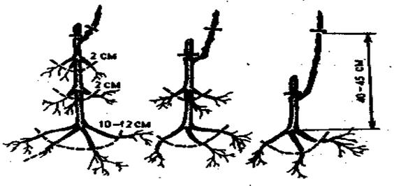 около поверхности почвы (рис. 42). Рис. 42. Обрезка саженцев винограда перед посадкой (пунктирной линией показана обрезка корней, черточками – надземной части).