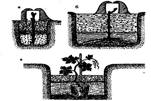 Рис. 43. Способы посадки винограда: а – черенком; б – саженцем; в - вегетирующим саженцем. По мере роста саженцы подвязывают к посадочным колышкам. На зиму лозу (без обрезки) укладывают вдоль рядов и заделывают землей. Весной следующего года приступают к обрезке. Почву на винограднике поддерживают в рыхлом состоянии и чистом от сорняков. Обрезка и формирование виноградного куста - важное и ответственное мероприятие. В культуре формируются кусты разной формы. В условиях Беларуси лучшей формой виноградного куста считается веерная, четырехрукавная, бесштамбовая. Для этого на протяжении первых двух лет после посадки побеги обрезают на 2 – 3 почки. На следующий год выбирают четыре побега, растущих поближе к земле, также обрезают на 2 – 3 почки для образования четырех рукавов. В дальнейшем на каждом рукаве с нижнего побега формируют сучок замещения с двумя почками, а из верхнего побега – плодовую стрелку с 4 – 6 почками и более. Стрелки веером подвязывают к проволоке шпалеры. После сбора ягод плодовые стрелки удаляют, а из побегов сучка замещения формируют новое плодовое звено (рис. 44).