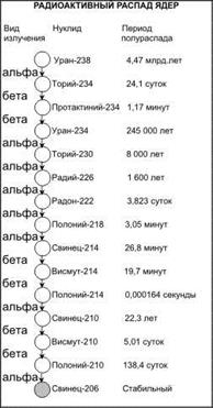 Мощность поглощенной дозы – приращение дозы в единицу времени. Она характеризуется скоростью накопления дозы облучения и может увеличиваться или уменьшаться во времени. Её единица в системе СИ – грей в секунду (Гр/с). Это такая мощность поглощенной дозы излучения, при которой за 1 с в веществе поглощается доза излучения в 1 Гр. На практике для оценки мощности поглощенной дозы излучения до сих пор широко используют внесистемную единицу мощности поглощенной дозы – рад в час (рад/ч) или рад в секунду (рад/с). Эта доза может создаваться как после внешнего, так и после внутреннего облучения. Как внешнее, так и внутреннее облучение человека создаётся антропогенными и естественные источники. Последние имеют земное и космическое происхождение. Среди первых решающую роль играют 40 α -радиоактивных изотопов. Они объединены в три радиоактивных ряда, которые начинаются с тория (232Th) и урана (238U и 235U). К ним можно отнести также и четвертый ряд – ряд нептуния, начинающийся c 237Np (многие радионуклиды из этого семейства уже распались). Отдельно от этих семейств находится калий-40 (40К) и рубидий-87 (87Rb). Один из первых открытых естественных радиоактивных элементов был «радий» – испускающий лучи, излучающий. Образование его и других естественных радионуклидов протекает в процессе самопроизвольных превращений (распадов) нуклидов семейства урана и тория. В качестве примера приводим на рис. 1.6 цепочку многочисленных превращений радионуклидов семейства 238U, сопровождающиеся α - или β -излучениями и завершающиеся образованием стабильного нуклида свинца. Наибольшую дозу облучения (50%) человек получает от радона-222 (222Rn) и его производных – представителей семейства 238U. (рис. 1.6). 14 % дозы создаётся g-лучами от земли и зданий, 12% - пищей и напитками, 10% - космическими лучами (внутреннее облучение за счёт космогенных радионуклидов: углерода-14 - 14C (12 мкЗв/год), берилия-7 - 7Ве (3 мкЗв /год), натрия–22 - 22Na (0, 2 мкЗв/год) и трития - 3H (0, 01 мкЗв/год). Внешняя поглощённая доза - доза, полученная человеком от источника, находящегося вне организма. Оно составляет почти 33% общей дозы облучения и создаётся потоком частиц или квантов от земли и зданий (главным образом калием-40), космическим излучением и антропогенными источниками. Жители Беларуси получают также дополнительное облучение за счёт чернобыльских радионуклидов. 90 % её создаётся цезием-137, 9% - стронцием-90 и 1% - изотопов плутония. После ядерного взрыва проникающая радиация создаётся потоком γ -лучей и нейтронов, испускаемых примерно в течение 10-25 секунд с момента ядерного взрыва. Поток γ -лучей - фотонов (F) – отношение числа ионизирующих частиц (фотонов) dN, проходящих через данную поверхность за интервал времени dt, к этому интервалу: F= dN/dt. Eдиница измерения потока ионизирующих частиц – частица / с (одна частица в секунду). Флюенс (перенос) ионизирующих частиц (фотонов) - отношение числа ионизирующих частиц (фотонов) dN, проникающих в объем элементарной сферы, к площади центрального поперечного сечения dS этой сферы: Ф = dN/dS. Единица измерения флюенса частиц – частица / м2 (одна частица на квадратный метр). Плотность потока ионизирующих частиц (фотонов, φ) - отношение потока ионизирующих частиц (фотонов) dF проникающих в объем элементарной сферы, к площади центрального поперечного сечения dS этой сферы: φ = dF/dS = dФ / dt = dN/dt•dS. Единица измерения пл