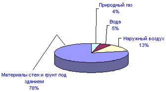 Рис. 2.7. Источники поступления радона в помещение радона в воздухе, в легких накапливаются значительные количества радиоактивных продуктов его распада, которые вызывают развитие различных легочных заболеваний и, в частности, рака. В соответствии с действующими нормативными документами, при выборе участков территорий под строительство жилых домов и зданий социально-бытового назначения предпочтительны участки с уровнем мощности дозы γ -излучения, не превышающими 0, 3 мкГр/ч и плотностью потока радона с поверхности грунта не более 80 мБк/(м2 •с). Для строительства зданий производственного назначения выбирается территория, где плотность потока радона с поверхности грунта не превышает 250 мБк/(м2•с). В новых жилых домах содержание радона не должно превышать 100 Бк/м3, в старых домах - допускается до 200 Бк/м3, но если его содержание превышает 400 Бк/м3, то жильцы должны быть переселены (при содержание радона в жилом доме 100 Бк/м3 жильцы его за счет радона получат среднегодовую эффективную эквивалентную дозу облучения 0, 61 сЗв/год).3) Искусственный радиационный фон Земли создаётся продуктами ядерного деления урана и плутония при испытаниях ядерного оружия и выбросами радионуклидов АЭС, промышленными и энергетическими реакторами. Такой же вклад вносят также искусственные (антропогенные) источники радиационного облучения, созданные в результате хозяйственной деятельности человека. Они используются: в медицине, при производстве электро- и тепловой энергии, для сигнализации о пожарах и изготовления светящихся циферблатов часов, многих приборов поиска полезных ископаемых и в военном деле и др. Вклад отдельных источников в облучение человека представлен на рис. 2.8 и в табл. 2.4.