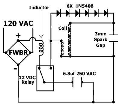 Полным выпрямителем по мостиковой схеме волны будет стандарт с деталя 400v собственной личности 5 amps или больше если вы желаете. Индуктор обязанности сердечника воздуха, котор я сделал от главным образом MOT я режу вне и после того как я свит ему. Отверстие центра индуктора 38mm. O.D. 60mm и ширина 40mm. От я могу сказать Mag провод будет датчиком около 14. Сопротивление DC катушек 0.4 ома и измеряет 2.23mH на моем метре индуктивности. Релеий будет автомобильным 12vdc релеим занявшее в рейтинге 40A/30A будет SPDT. Я не показал катушку релеего в диаграмме в виду того что черная отметка, котор я использовал слишком большая для того чтобы показать детали. Нейтральное положение релеих находится на мосте, котор нужно покрыть. Я использую батарею 12vdc для того чтобы активировать катушку релеего для того чтобы discharge крышка к шнуру катушки и диода. Конденсатор будет (non поляризовыванным) AC 6.8uf 250. Я иду эта крышка вне блок TV цвета старой тяжелой древесины 30 ". Я не знаю почему а эта крышка принимает самые лучшие пиковые обязанности и дает изумительный челку на свой размер Huh uF мой метр емкости, котор говорит это будет 6.9uf но даю такой же вид челки мое поляризовыванное 22uf 350v, которое я также проверяю на метре и оно будет фактическ 26uf. Я не понимаю то. Катушка будет автомобильной катушкой сделанной частью Accel дальше. 8140C. Главным образом сопротивление DC 1.3 ома и измеряет 6.46mH на метре индуктивности. Вторичное сопротивление DC 9.10 ома k и я не могу измерить h на моем метре. Диоды будут шнуром 6 из 1N5408 последовательно и занявший в рейтинге на 1000 вольтах на 3A каждом. Свеча зажигания используемая для зазора искры от двигателя травокосилки газа 3HP будет использован для испытывать цепь. Изменения к штепсельной вилке являются следующими: Я режу электрод j и также сохранили вниз с разбивочного электрода настолько обоих находитесь на таком же уровне. С этим mod штепсельная вилка теперь имеет зазор 3mm. Резистор штепсельных вилок внутренне извлекался и заменялся ть с 3 pcs провода правильно датчика длины 14 твердого медного для выполнения контакта.