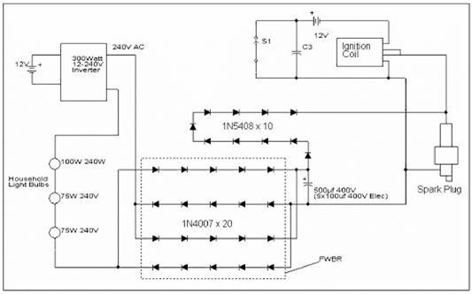 Более дальнеиший анализ показал что было требование отключить электропитание пока конденсатор discharged в плазму для того НОП не к неныжной энергии. Воздерживающся сложная цепь переключения HV, я нашел что индуктор smog помочь в держать расточительствованную энергию от электропитания пока конденсатор discharging в плазму и после этого когда плазма переключит, задний emf индуктора сбросит его имеет скрытую энергию в конденсатор готовый для следующей разрядки и поэтому не расточительствована а использована энергия электропитания. Пожалуйста см. принципиальную схему ниже.