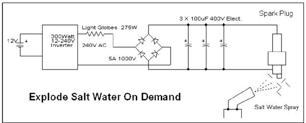Вышеуказанное - упомянутые цепи были основаны на иметь порученный конденсатор и преграждать диод/диоды соединенные через свечу зажигания. После этого искра HV от катушки зажигания также помещена через свечу зажигания. Эта искра зажигания ионизировала воздух и любую воду в контакте с электродами свечи зажигания. Эта ионизация позволила энергию в конденсаторе быть discharged и причиняет сильную и яркую электрическую разрядку плазмы между электродами свечи зажигания. Вода на электродах, когда в контакте с плазмой, взорвала бы как описано в бумагой Graneau. Построенные диаграммы или схемы, видеоих и изображения этих и доказанные цепи можно найти в моих ранее столбах на этой резьбе.