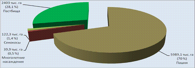 Сельскохозяйственные угодья - это земельные угодья, систематически используемые для получения сельскохозяйственной продукции. В составе земель сельскохозяйственного назначения сельскохозяйственные угодья имеют приоритет в использовании и подлежат особой охране. Перевод их в другие категории и предоставление для несельскохозяйственных нужд допускается в исключительных случаях с учетом кадастровой стоимости угодий. Большая часть сельскохозяйственных угодий относится к категории земель сельскохозяйственного назначения (8153, 8 тыс. га или 94, 9 %). В категории земель населенных пунктов 202, 2 тыс. га сельскохозяйственных угодий или 2, 4 %, в землях запаса 140, 1 тыс. га с/х угодий или 1, 6 %.