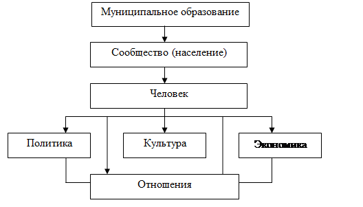 Цель социально-экономического развития муниципального образования — улучшение качества жизни каждого человека сообщества. Уровень социально-экономического развития, качество жизни населения в целом и конкретных граждан в значительной степени определяются уровнем компетентности команды менеджеров муниципального уровня, их способностью осуществлять активную, последовательную, ответственную управленческую деятельность. В Конституции РФ присутствуют термины «муниципальное образование», «местное самоуправление», «органы местного самоуправления». Под муниципальным образованием понимается городское, сельское поселение, несколько поселений, объединенных общей территорией, часть поселения, иная населенная территория, в пределах которых осуществляется местное самоуправление, имеются муниципальная собственность, местный бюджет и выборные органы местного самоуправления[9]. Местное самоуправление как выражение власти народа — самостоятельная и под свою ответственность деятельность населения по решению непосредственно или через органы местного самоуправления вопросов местного значения исходя из интересов населения, его исторических и иных местных традиций. Органы местного самоуправления — выборные и другие органы, наделённые полномочиями на решение вопросов местного значения и не входящие в систему органов государственной власти. Представительный орган местного самоуправления — выборный орган местного самоуправления, обладающий правом представлять интересы населения и принимать от его имени решения, действующие на территории муниципального образования. Муниципальное образование — это не просто место совместного проживания людей. Оно объединяет сообщество в систему, состоящую из элементов (экономика, культура, право, политика и социальные отношения), функционирование которых направлено на достижение генеральной цели — рост качества жизни каждого человека. В структуре муниципального образования (далее — МО). (Рис. 10.1) особая роль принадлежит экономической сфере. Она играет ведущую роль в жизнедеятельности населения и тесно взаимосвязана с остальными структурными элементами МО. Одним из перспективных вариантов управления развитием МО является организационный принцип корпоратизма. Организация социально-экономического развития сообщества как корпорации с экономической точки зрения, определяет следующую принципиальную схему управления: «население — акционеры — совет — менеджмент», которая является зеркальным отражением системы: «население — избиратели — представительная власть — администрация», реализуемой в сфере политического управления. Главная цель такой системы управления состоит в необходимости создания ясно очерченной и эффективной системы контроля (отчетности и подотчетности) за социально-экономическим развитием муниципального образования.