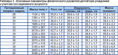 Диагностика нарушений роста и развития новорожденных предусматривает прежде всего оценку основных параметров физического развития ребенка (массы тела, роста, окружности головы, груди), пропорциональности телосложения, состояния питания (развития и распределения подкожного жирового слоя), мышечной массы, зрелости по внешним клиническим и неврологическим признакам, а также оценку церебральных нарушений, выявление аномалий и дизэмбриогенетических стигм [22, 28]. Дальнейшая диагностика производится с помощью таблицы основных параметров физического развития при рождении в зависимости от гестационного возраста, разработанной Г.М. Дементьевой и Е.В. Короткой [28] (табл. 1).
