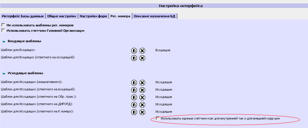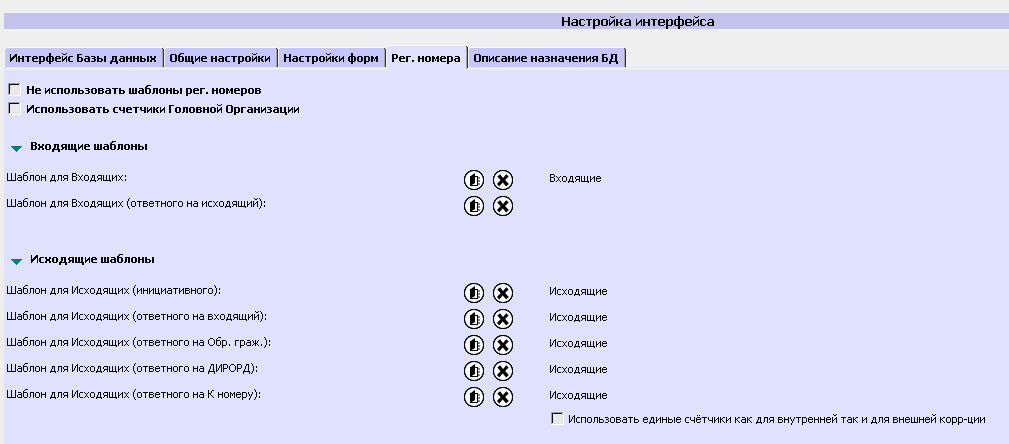 Настройки, произведенные на этой закладке, позволят присваивать документам регистрационные номера, принятые в ГО. Шаблоны регистрационных номеров создаются в БД Справочник (см. раздел «Управление регистрационными номерами»). Если сделать отметку «Не использовать шаблоны рег. номеров», то при регистрации РКК регистрационный номер не присваивается, а в момент регистрации откроется БД Справочник для ручного выбора шаблона регистрационных номеров. Если сделать отметку «Использовать счетчики Головной Организации», то при регистрации РКК будут использоваться счетчики головной организации. Выбор необходимого шаблона регистрационного номера осуществляется нажатием кнопки Для ГО, использующих сквозную нумерацию, внутренней и внешней корреспонденции предназначено поле «Использовать единые счетчики, как для внутренней, так и внешней корреспонденции» (Рисунок 95).