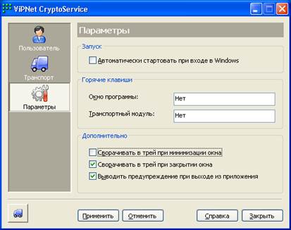 Рисунок 7 В этом окне можно настроить: ------------------------------------ Запуск -------------------------------------- · Автоматически стартовать при входе в Windows – по умолчанию флажок снят. Если установить флажок, то при входе в Windows программа ViPNet CryptoService запустится автоматически. После загрузки программы ViPNet CryptoService появится значок программы ------------------------------------ Горячие клавиши ------------------------- · Окно программы – назначение горячей клавиши или комбинации клавиш (например, Ctrl+Shift+1) для вызова главного окна, по умолчанию клавиши не назначены. · Транспортный модуль – назначение горячей клавиши или комбинации клавиш (например, Ctrl+Shift+2) для вызова транспортного модуля ViPNet MFTP, по умолчанию клавиши не назначены. ------------------------------------ Дополнительно --------------------------- · Сворачивать в трэй при минимизации окна – по умолчанию флажок снят. Если установить флажок, то при минимизации окна (например, если в главном окне программы в правом верхнем углу нажать на " 0") главное окно свернется в значок · Сворачивать в трэй при закрытии окна – по умолчанию флажок установлен. Т.е. при закрытии окна (например, если в главном окне программы в правом верхнем углу нажать на " r") главное окно свернется в значок · Выводить предупреждение при выходе из приложения – по умолчанию флажок установлен. Т.е. при выходе из программы будет выводиться предупреждение о том, что после завершения работы программы, Вы не сможете принимать обновления из ЦУС. Все произведенные действия можно принять (сохранить), если нажать кнопку Применить или отменить, если нажать кнопку Отменить.