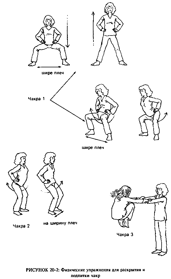 Ниже описаны три комплекса упражнений для заряда и раскрытия чакр. Первый комплекс раскрывает чакры на трех нижних уровнях ауры. Второй комплекс помогает раскрыть чакры на астральном уровне. И третий комплекс физических и дыхательных упражнений служит для раскрытия чакр на высших уровнях ауры. Физические упражнения для раскрытия и заряда чакр (1-3-й уровни аурического поля)