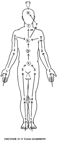 Слово «кодирование» греческое по происхождению и означает «выскребание». Преп. Розалин Брюйер, открывшая и развившая эту технику, использовала это слово для обозначения очистки поля пациента через устранение аурических обломков. Келирование так же наполняет ауру энергией, как при надувании воздушного шара, и уравновешивает ее в целом. Это делается путем последовательного проведения энергии по телу, начиная со стоп. Лучше всего проводить энергию наиболее естественным для нее путем, это создает равновесие и здоровье во всей системе. Поэтому энергия пропускается по телу со стоп, ибо ее естественный ход начинается из земли вверх к первой чакре через две чакры на ступнях. Эти земные энергии всегда необходимы в целительстве физического тела, поскольку они обладают низкими физическими вибрациями. Вы проводите энергию по истощенной системе так, чтобы она шла самым естественным путем. Через это энергетическое тело вбирает энергию и переносит ее туда, где она необходима. Если же вы, наоборот, начнете с поврежденной области, энергетическое тело вполне может перенести энергию в другое место, прежде чем действительно начнет питать необходимую область. Поскольку это течение не является естественным, его недостаточно. Посмотрите на начало кодирования (рис.21-2). На последующих иллюстрациях в этой главе будет показано то, как аура человека изменяется в ходе завершения целительства.