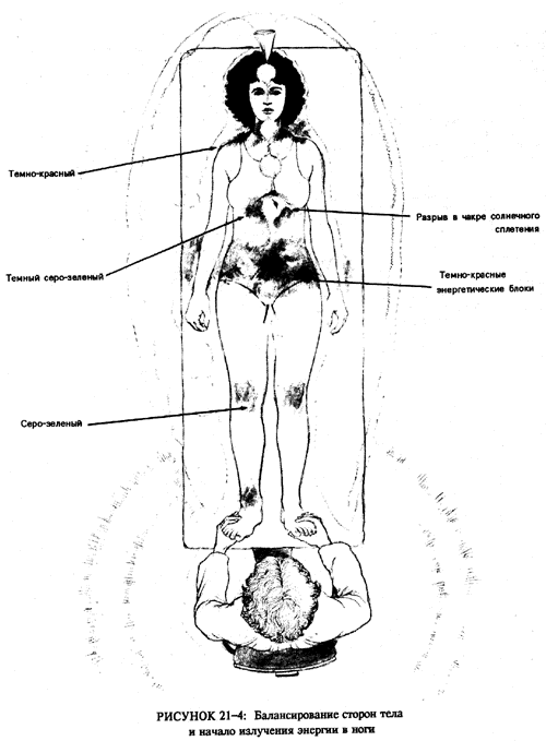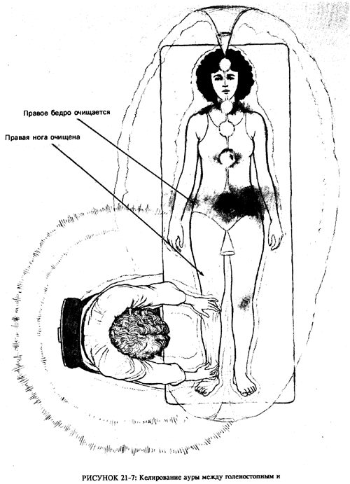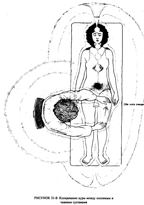 Посылайте энергию из правой руки через нижнюю часть левой ноги пациента в вашу левую руку. Сначала поток, возможно, будет слабым и неравномерным. Когда наполнение завершится, перемещайтесь к правой лодыжке и колену (рис. 21-7). Когда вы келируете между лодыжкой и коленом, темные облака в правой тазобедренной области слабеют, и поле там становится ярче. Затем начинают очищаться затемнения на левой стороне солнечного сплетения. Продолжайте работать с ногами от сустава к суставу, от колена к бедру, на левой стороне, на правой стороне (рис. 21-8). В ходе работы с телом аура пациента будет продолжать очищаться и его состояние сознание будет изменяться. Двигайтесь от бедра ко второй чакре (рис. 21-9). Сейчас поле пациента в области таза чистое, особенно между вашими руками. В этой позиции ваша правая рука находится на бедре пациента, а левая — в центре второй чакры, непосредственно над лобковой костью. Повторите на другой стороне тела. Вы будете ощущать очистительные изменения в ауре по подъему и спаду потока энергии во время своего перемещения. Налагая руки на новое место, вы ощутите, что вначале энергия течет слабо, покуда не установится связь между вашим полем и полем пациента. Течение будет возрастать и, достигнув высшей точки, медленно стихать, после чего либо остановится, либо будет очень медленным. Это значит, что можно следовать дальше. Вы будете ощущать энергетический поток в форме покалывания или волн тепла. Прежде чем следовать дальше, убедитесь, что течение энергии равномерное на обеих сторонах части тела. Это касается как обеих сторон тела, так и обеих сторон каждой ноги. После очищения, зарядки и уравновешивания второй чакры переместите правую руку на вторую чакру, а левую — на третью (рис.21-10). С Мэри вам будет нужно уделить больше времени второй и третьей чакрам, поскольку они наиболее блокированные. Очистив эту область, положите правую руку на третью чакру, а левую — на четвертую.