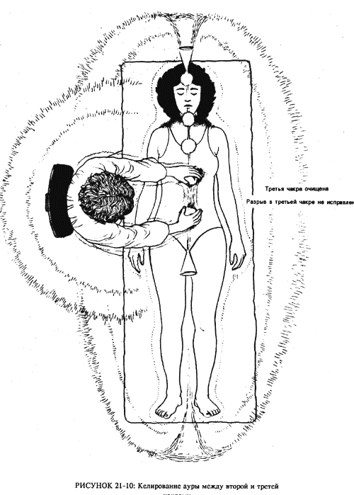 Сейчас, когда вторая и третья чакры стали более тесно взаимосвязанными, Мэри пытается сдержать свои чувства. Вы поощряете темп ее дыхания. Она глубоко дышит и плачет, ощущая свое одиночество. И вы тоже. Вы можете ощущать или видеть соответствующие детские переживания Мэри. Поделитесь этим с нею. Сейчас она осознает связь и плачет еще сильнее. В результате выражения чувств ее вторая и третья чакры становятся более открытыми и чистыми. Если у вас проблемы с переживанием этих ощущений, измените свое дыхание, чтобы выровнять и поднять сознание на более высокий уровень. Продолжайте посылать энергию. По мере того, как чакры Мэри очищаются, она становится спокойной и тихой. Рис.21-11 показывает, что келирование очистило четыре нижних уровня поля Мэри, но это не устранило разрыв. Третьей чакре необходимо особое внимание на третьем и седьмом слоях, где находится разрыв. Чтобы кодировать четвертую, пятую и шестую чакры, просто продолжайте двигаться вверх по телу, помещая левую руку на верхнюю чакру, а правую — на нижнюю. Большинство пациентов будут ощущать себя более комфортно, если, работая с пятой чакрой, вы положите левую руку под шею, а не сверху на нее. Затем, сидя у изголовья, уравновесьте правую и левую стороны энергетического поля Мэри. Затем медленно перемещайте руки вверх от шеи к вискам, приводя энергию в движение. В этот момент, если вы студент, переходите к шестому пункту целительства. Отработайте на шестом слое и завершите «запечатлением кетерного определяющего уровня». Если у вас еще нет опыта в целительстве, не стремитесь пока делать больше этого. Вначале для этой работы вам потребуется около часа времени. После продолжительной практики вы начнете воспринимать верхние слои поля ауры и тогда начинайте работать с ними как указано в пунктах 4 и 5. Еще позже, возможно, вы будете воспринимать слои выше седьмого и начнете работать на восьмом и девятом уровнях, как описано в пункте 7.