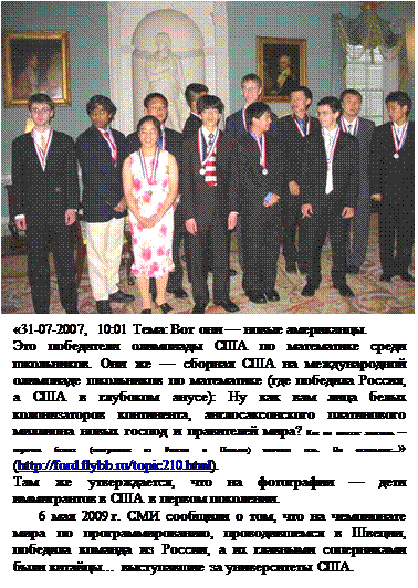 Особенность США — только в статистике проявления одного специфического фактора. Дело в том, что зачатие ребёнка вне Любви[151] родителями, принадлежащими к разным социальным группам, обладающим генетическим своеобразием, достаточно часто имеет следствием биологическое вырождение потомства, во-первых, по причине взаимной несогласованности генетической информации, попавшей в геномы детей с хромосомами разноплемённых предков и, во-вторых, по причине несовместимости информационно-алгоритмического обеспечения их родовых эгрегоров, которая может угнетать развитие ребёнка и в аспекте развития тела, и в аспекте формирования дееспособной психики. Вследствие действия названных факторов образовательный и творческий потенциал потомства в течение нескольких поколений будет снижен, и у потомков возникнут более или менее ярко выраженные проблемы с обучением и творческой деятельностью.[152] В США, где первопредки-американцы нынешнего населения (за исключением относительно малочисленных потомков индейцев) — исторически недавние иммигранты со всего мира, чьи генетические линии впоследствии переплетались самым причудливым образом при продолжении рода, эта особенность действия генетического механизма вида «Человек разумный» в отсутствие Любви должна проявляться более ярко, нежели в других государствах с этнически более однородным или менее интенсивно перемешиваемым кровно-генетически населением[153]. Возможно, что действие именно этого фактора и лежит в основе анекдота: «Американский университет — это место, в котором русские евреи учат китайцев и индусов математике и физике» (https://ford.flybb.ru/topic210.html). Станут ли эти «китайцы», «индусы» и их дети «США-анцами» — вопрос во многом открытый, поскольку характер информационных процессов в XXI веке не такой, каким был в XIX: изменилось соотношение эталонных частот биологического и социального времени — скорость обновления информации, культурологического характера (социальный процесс) стала выше скорости обновления информации, запечатлённой в генетическом механизме вида «Человек разумный», при смене поколений в обществе (биологический процесс); кроме того, появились средства глобальной коммуникации, доступные практически всем, а не только “элите”, «дипкорпусу», «журналистам-международникам», как это было в прошлом. Тем не менее нынешний президент США Б.Х.Обама в своей книге “Дерзость надежды. Мысли о возрождении американской мечты” признаёт, что проблемы с обучением подрастающих поколений есть: «Сегодня у американцев высочайший среди развитых стран процент отсева из государственных школ. Ученики старших классов показывают худшие знания по математике и естественным наукам, чем их зарубежные сверстники. Половина подростков не имеет представления об элементарных дробях, половина девятилетних не умеют ни делить, ни умножать, и, хотя количество поступающих в высшие учебные заведения повысилось, только двадцать два процента абитуриентов достаточно подготовлены, чтобы пройти университетский курс английского языка, математики и естественных наук» (“Дерзость надежды”, стр. 181). И ещё одно сообщение: «Исследования, проведённые недавно на средства правительства США, показали, что более половины американцев подвержены психическим расстройствам» (“Известия” от 29.06.2005 г., со ссылкой 
