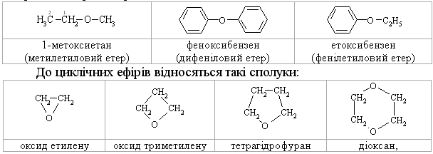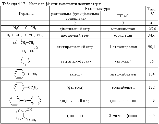 які за своєю реакційною здатністю (за винятком оксиду етилену) нагадують звичайні прості ефіри. Етери називають за радикально-функціональною номенклатурою та номенклатурою IUPAC (табл. 4.17) Назва за номенклатурою IUPAC: префікс алкокси- (AlkO–), арилокси- (ArO–) групи + старший вуглеводень. Назва за радикально-функціональною номенклатурою: вуглеводневі радикали + етер.