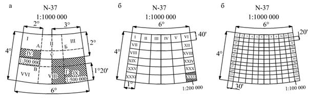Из вышеуказанного видно, что между масштабом карты и номенклатурой существует взаимно однозначное соответствие, т.е. каждому масштабу соответствует своя номенклатура, и каждой номенклатуре соответствует свой масштаб. Лист карты масштаба 1: 100000 служит основой для листов плана масштаба 1: 5000 и 1: 2000. Одному листу карты масштаба 1: 100000 соответствует 256 (16 по долготе и 16 по широте) листов плана масштаба 1: 5000, которые обозначаются цифрами от 1 до 256, заключенными в скобки, т.е. N – 37 – 144-(112) Одному листу плана масштаба 1: 5000 соответствует 9(3х3) листов плана 1: 2000, которые обозначаются русскими буквами от а до и, также заключенными в скобки, т.е. N – 37 – 144-(112-г) При съемке участков местности менее 20 км2 допускается применение прямоугольной разграфки планшетов. В основу этой разграфки положен планшет масштаба 1: 5000 размером 40х40 см, обозначаемый арабским цифрами. Ему соответствует 4 листа масштаба 1: 2000, каждый из которых обозначается присоединением к номеру планшета масштаба 1: 5000 одной из прописных букв русского алфавита А, Б, В, Г. Листу плана масштаба 1: 2000 соответствует 4 листа масштаба 1: 1000 и обозначаемых римскими цифрами I, II, III, IV и 16 листов масштаба 1: 500 (обозначаются цифрами от 1 до 16). Такая разграфка приводит к образованию планшетов масштабов 1: 2000, 1: 1000, 1: 500 размером 50х50 см