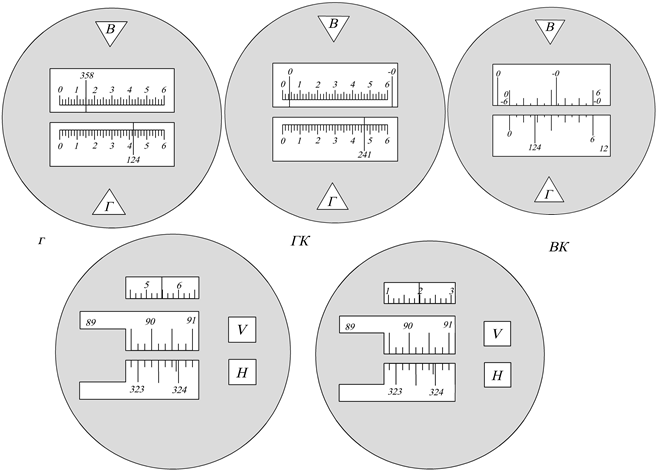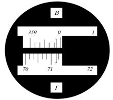 Рядом с окуляром зрительной трубы находится окуляр отсчетного приспособления. С помощью специальных призм изображения горизонтального и вертикального кругов снесены в поле зрения отсчетного приспособления, а с помощью светового пучка из окошечка, находящегося сбоку, можно их увидеть.