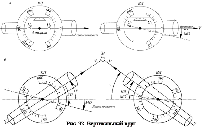 Для измерения угла наклона необходимо фиксировать горизонтальную плоскость, что достигается с помощью уровня при алидаде горизонтального круга. В некоторых приборах имеется специальный уровень при вертикальном круге или компенсатор. В теодолите 2Т30 вертикальный круг наглухо закреплен со зрительной трубой и вращается вместе с ней. В устройстве при приведении в рабочее положение при горизонтальном положении визирной оси должны совпадать нулевые штрихи вертикального круга и отсчетного микроскопа. Чаще всего на практике это не так.