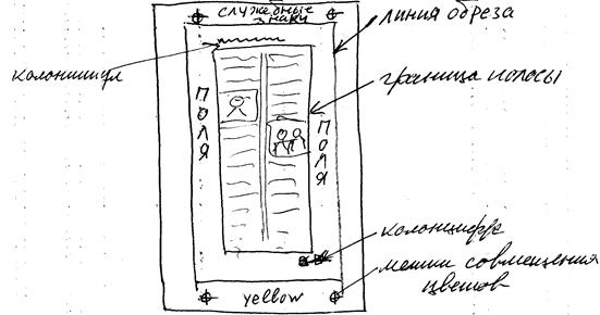 а) Пространство за обрезом, в готовое изделие эта область не попадает, здесь располагаются служебные типографские обозначения. Например, для цветной страницы здесь ставятся метки совмещения цветов, по этим меткам формы в печатной машине устанавливаются с высокой точностью — до сотых долей миллиметра. Здесь же пишется цвет, который отображает эта пленка (основные цвета CMYK, пантоны, заказные цвета и пр.). Для многостраничных книг или журналов могут ставиться цифры, руководствуясь которыми собирают вместе печатные, листы (а на каждом листе 4 страницы). б) Поля от обреза до границы полосы. 1. Большие поля создают иллюзию свободного пространства, облегчают восприятие информации. 2. Самым большим лучше всего делать нижнее поле, потому что глаз видит середину вертикального предмета несколько выше ее геометрического центра. 3. Чтобы полоса смотрелась в центре, ее надо сместить чуть вверх. 4. Самым маленьким делают внутреннее поле, корешковое. На развороте два корешковых поля визуально сливаются в одно, и чтобы это одно поле гармонировало с боковыми полями, корешковые делают небольшими. 5. В традиционных печатных изданиях, где главенствующую роль играет текст, поля делают однородно белыми, а содержание помещают внутри полосы набора. Это почти все книги и газеты, большинство журналов и других изданий. 6. Однако обложки, а часто и полностью яркие, красочные публикации, особенно рекламного характера, делают с размещением иллюстраций в обрез. Это эффектный метод, но он приводит к повышенному расходу бумаги. Он полезен, там, где нужно привлечь внимание, а где требуется сосредоточиться на тексте, эффектные иллюстрации будут отвлекать от содержания. 7. Что всегда располагают на полях, так это колонтитулы и колонцифры. в) Колонтитулы нужны для лучшей ориентации в материале. В книге колонтитулы указывают, к каким разделам относятся страницы разворота. Левый колонтитул указывает на более крупный раздел, правый на более мелкий подраздел. В периодике (газетах, журналах) в колонтитулы кроме тематики выносят также выходные данные журнала (название, год, номер). Тогда если материал будет ксерокопироваться, то на копии всегда окажется ссылка на источник, откуда взята копия. В словарях в колонтитул выносится слово, с толкования которого начинается страница. г) Колонцифра показывает номер страницы, обычно располагается внизу, но моет быть и вверху и сбоку, если захотят сделать почуднее.
