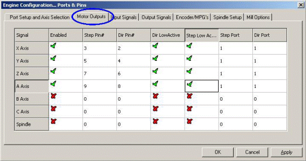 With strategy two you will probably have home switches on the X, Y and Z axes. Enable the Home switches boxes for these axes and define the Port/Pin to which each is connected. If you are combining limits and the home switch then you should enable the Limit --, the Limit ++ and Home for each axis and allocate the same pin to Home, Limit— and Limit++. Notice the scroll bar to access the rest of the table which is not visible in figure 5.5. The Input #1 is special in that it can be used to inhibit running a part program when safety guards are not in place. The other three (and #1 if not used for the guard interlock) are available for your own use and can be tested in the code of macros. The Input #4 can be used to connect an external pushbutton switch to implement the Single Step function. You may wish to configure them later. Enable and define Index Pulse if you have a spindle sensor with just one slot or mark. Enable and define Limits Override if you are letting Mach2 control your limit switches and you have an external button which you will press when you need to jog off a limit. If you have no switch then you can use a screen button to achieve the same function. Enable and define EStop to indicate to Mach3 that the user has demanded an emergency stop. Enable and define OEM Trigger inputs if you want electrical signals to be able to call OEM button functions without a screen button needing to be provided. Enable and define Timing if you have a spindle sensor with more than one slot or mark. Enable Probe for digitising and THCOn, THCUp and THCDown for control of a Plasma torch. If you have one parallel port then you have 5 available inputs; with two ports there are 10 (or with pins 2 to 9 defined as inputs, 13). It is very common to find that you are short of input signals especially if you are also going to have some inputs for glass scales or other encoders. You may have to compromise by not having things like a physical Limit Override switch to save signals! You can also consider using a Keyboard Emulator for some input signals. Click the Apply button to save the data on this tab.