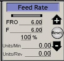 Так как современные резаки часто классифицируются по разрешенной нагрузке на инструмент, то возможно удобнее будет определять подачу на оборот. DRO Prog Feed указывает скорость подачи в текущих единицах (дюймы/миллиметры) на оборот шпинделя. Это значение задается выражением F в управляющей программе или вводом в DRO.