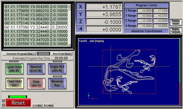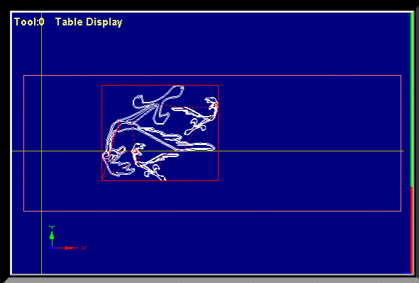 При случае вы заметите что дисплей не следует в точности по запланированному пути. Это случается по следующей причине. Mach3 делает приоритетом выполнение задачи. Отсылка точных шаговых импульсов в станок является главным приоритетом. Отрисовка пути инструмента имеет меньший приоритет. Mach3 рисует точки на пути инструмента когда появляется свободное время и соединяет их прямыми линиями. Так что если времени мало, то будет нарисовано всего несколько точек, и окружности будут казаться полигональными и прямые стороны очень заметны. Беспокоиться тут не о чем. Кнопка Simulate Program Run выполнит G-код, но без каких-либо движений инструмента, и позволит замерить время на изготовление детали. Program Limits Data позволяет проверить является ли допустимым максимальное отклонение управляемой точки (например не фрезеруя поверхность стола). Скриншот также показывает DRO оси и некоторые элементы управления Запуском Программы. Если вы определили программные ограничения которые отвечают размеру стола вашего станка, то часто полезным будет использовать кнопку Display Mode чтобы переключаться из режима Job в режим Table чтобы посмотреть на путь инструмента по отношению к столу. Смотрите рисунок 6.11