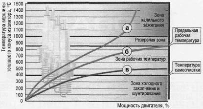 Выбор свечи для двигателя по калильному числу зависит от многих факторов: организации рабочего процесса сгорания, мощности двигателя, степени сжатия, частоты вращения, охлаждения и т. д. Например, на автомобиле ГАЗ-21 «Волга» применялись свечи А8НГ с калильным числом 8. На автомобилях ВАЗ используются свечи А17Д. Наиболее «холодные» свечи типа А23 и А26ДВ были необходимы для двигателей ММЗ-968 и опытных роторных моторов ВАЗ-311. Нет свечей, пригодных для любого двигателя. Для примера на рисунке 3 приведены характеристики «горячей» (а), «нормальной» (б) и «холодной» (в) свечей зажигания, установленных на одном и том же двигателе. Видно, что у «горячей» уже при половинной мощности двигателя температура теплового конуса будет выше 850 °С, и с повышением нагрузки она сразу же вызовет калильное зажигание. «Холодная» лишь при мощности более 50% начинает самоочищаться, а при меньших нагрузках тепловой конус будет покрываться токопроводящим шунтом. Поэтому, в данном случае подходит лишь «нормальная» свеча. Кроме тепловых нагрузок свечи подвержены также воздействию механических, электрических и химических нагрузок. Так давление в цилиндре двигателя достигает 5...6 МПа (максимальное давление в цикле), поэтому на поверхность свечи, находящейся в камере сгорания, действует усилие, составляющее около 0, 5...1, 2 КН. При нарушении герметичности свечей в соединении изолятора центрального электрода с корпусом происходит пропуск отработавших газов наружу. Это вызывает перегрев нижней части изолятора, в результате чего происходит преждевременное воспламенение рабочей смеси раскаленными изоляторами свечей, и возникают перебои в работе цилиндров двигателя.